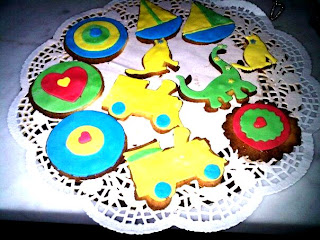 Mentre i frollini sono in forno, voi lavorerete diversi pezzi di pasta di zucchero con altrettanti colori alimentari (sempre quelli che vorrete usare), formerete come delle palline da ping pong (mettete al centro 3 o 4 gocce di colore, diminuendo o aumentando la quantità lo intensificherete o lo allegerirete) azzurre, verdi, rosse ecc., mentre la lavorate, vi renderete conto che la pasta di zucchero nelle vostre mani, si scioglie e diventa appiccicosa! Ecco che entra in campo lo zucchero a velo. Lo dovrete usare come si usa la farina con gli impasti per la pasta fatta in casa! Mattarello alla mano (di plastica o di silicone, il legno non va bene!) stendetela e tagliatela con gli stessi tagliabiscotti che avete usato per la frolla, una volta che i biscotti saranno cotti e freddi, li spennellerete con del miele o della marmellata di albicocche (comunque una marmellata chiara, sarà la vostra colla!) ma senza esagerare...giusto un velo! Dopodichè adagerete la pasta di zucchero intagliata sul frollino, ora scatenate la fantasia! Vi mostro alcuni esempi: